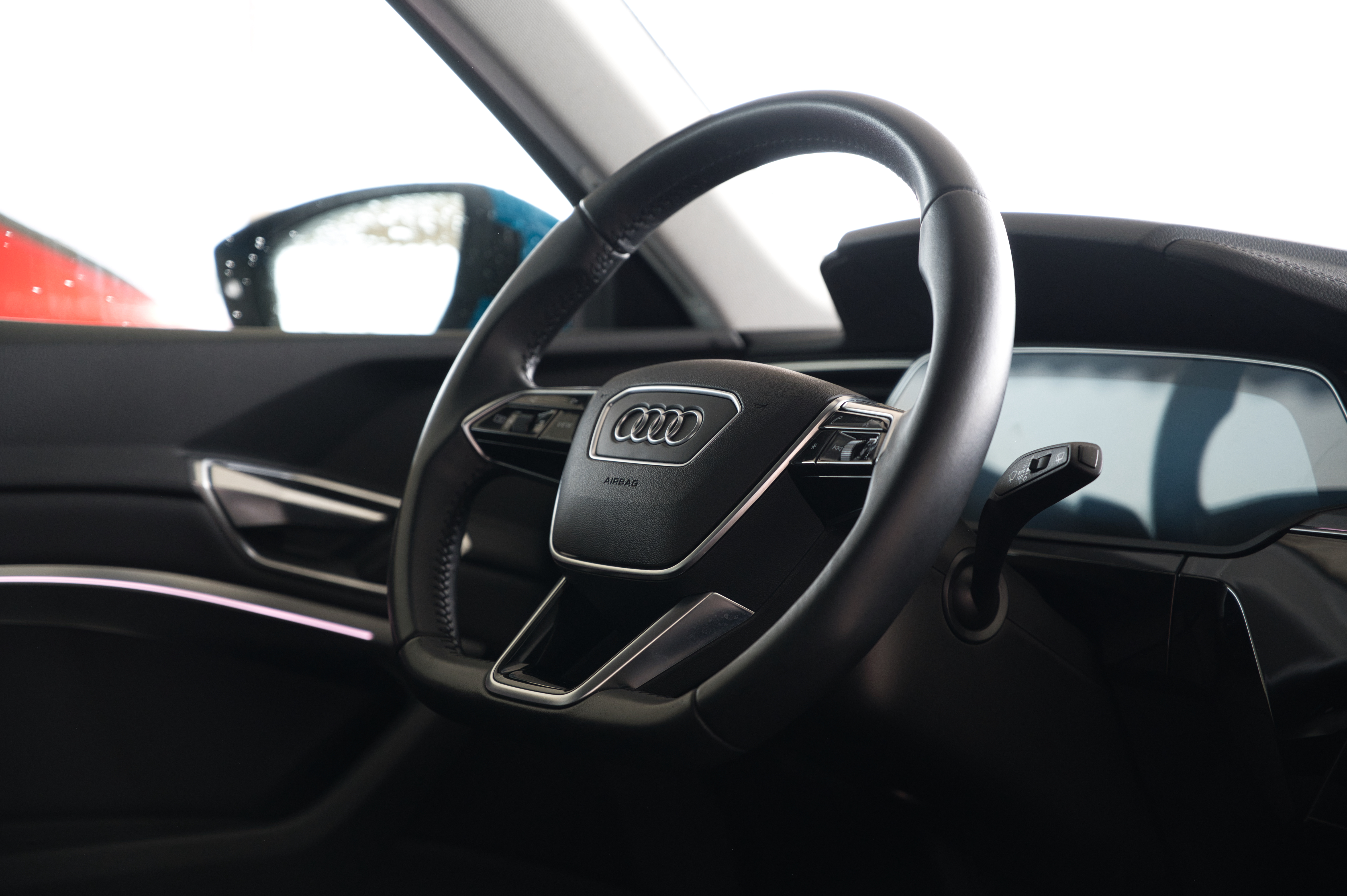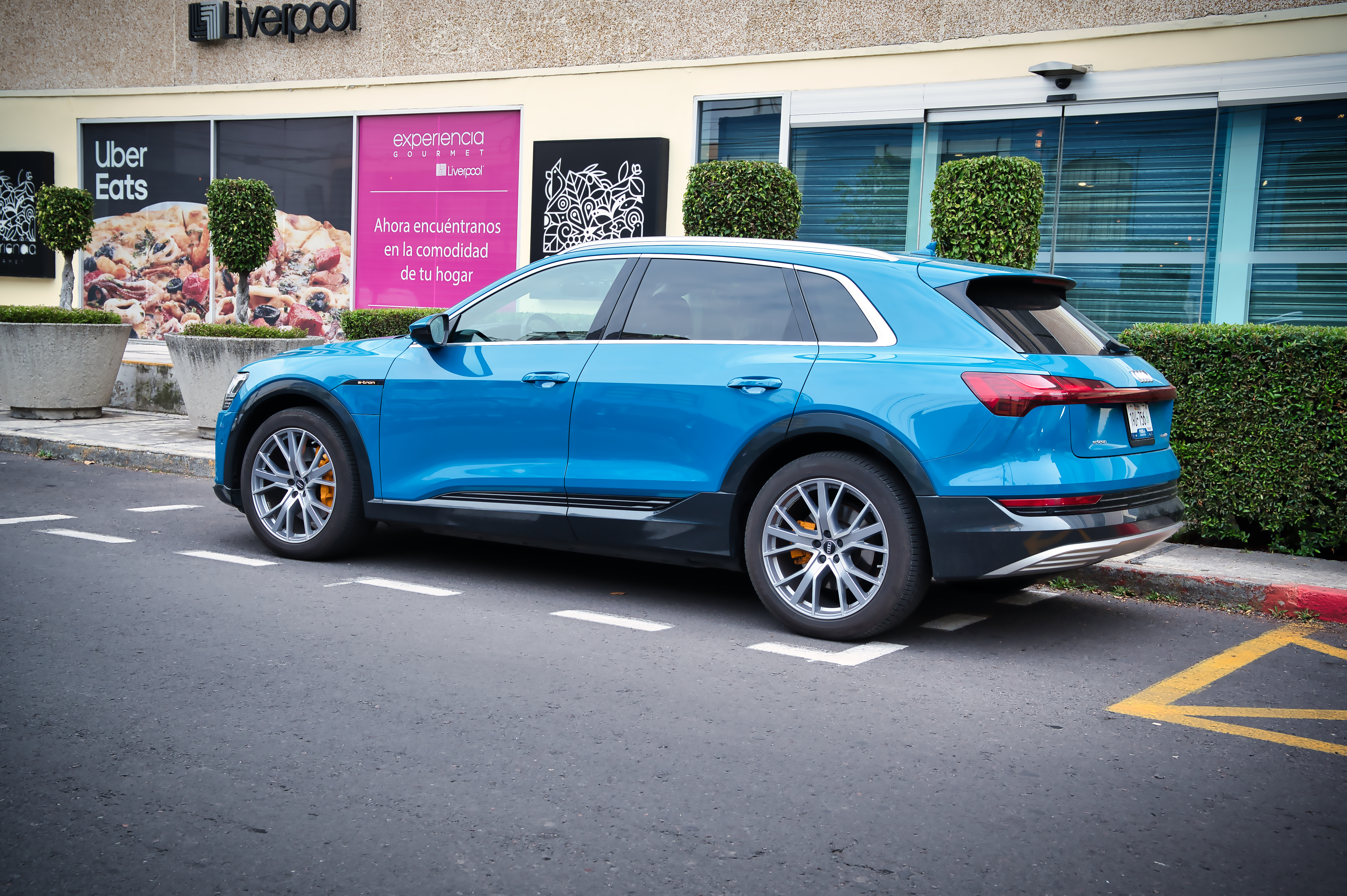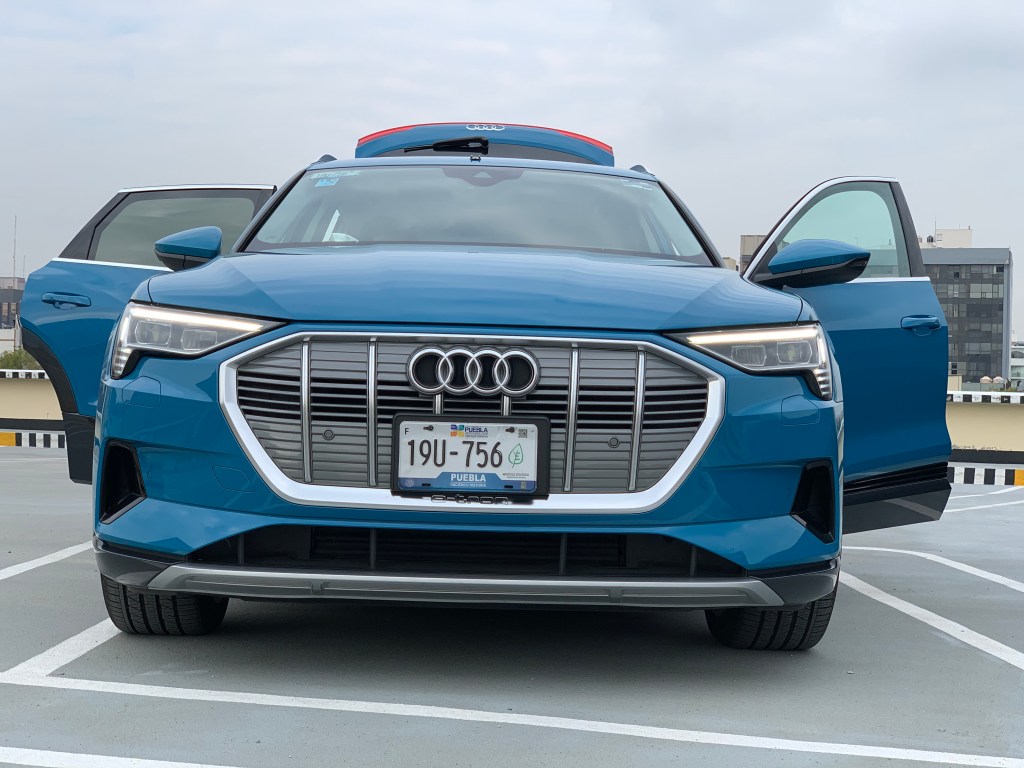 La primera en llamar mi atención es la Audi e-tron la verdad guardo cierto amor a Audi por haber sido mi primer vehículo Premium por lo que es imposible no sentir un poco de nostalgia y buenos recuerdos. Al verla por fuera es muy parecida a una Q3, tal vez un poco mas grande, pero no hay mas en diseño solo un color azul eléctrico que llama mucho la atención, una parrilla que pareciera ventilara un motor de combustión y rines muy deportivos que no ayudaran mucho a su autonomía. Por dentro la cosa si es un poco distinta tres pantallas en total (Virtual Cockpit y dos en la consola central) de muy buena resolución todas y siendo sincero un interior bonito, lujoso y con una palanca de velocidades extraña que no descubriría como usar hasta el día siguiente.