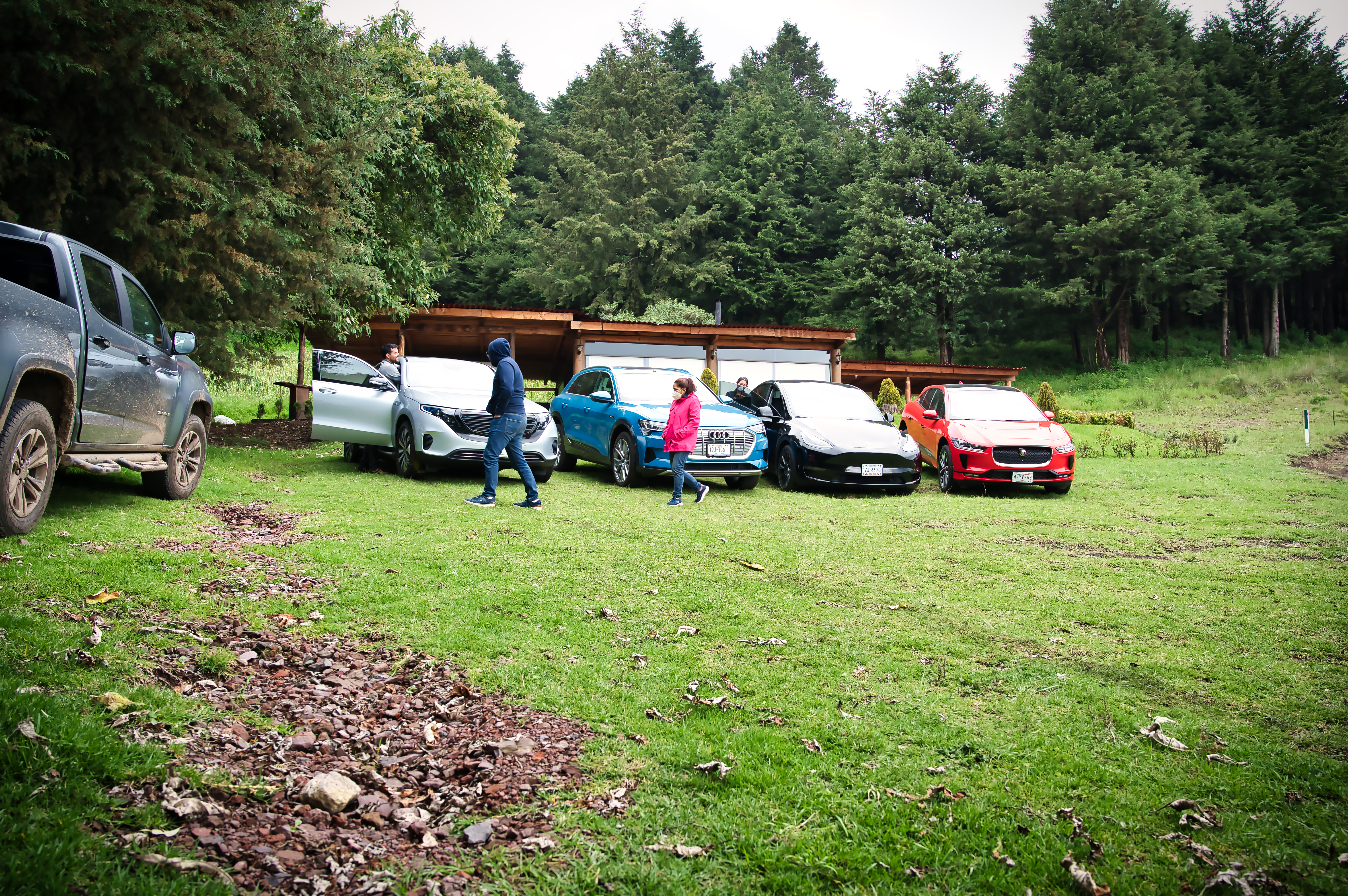 Llegando a un lugar cerca de la Marquesa, donde iniciaremos las pruebas “Off Road”, nos detenemos a comparar la autonomía de las cuatro ya que justo pusimos sus odómetros en cero y manejamos la misma distancia. La sorpresa, para ellos, es que Model Y tiene mucho mejor rendimiento en el promedio 1km/KWH mas que las otras, la peor en este rubro es Audi e-tron y las otras dos muy parejas casi con los mismos números.