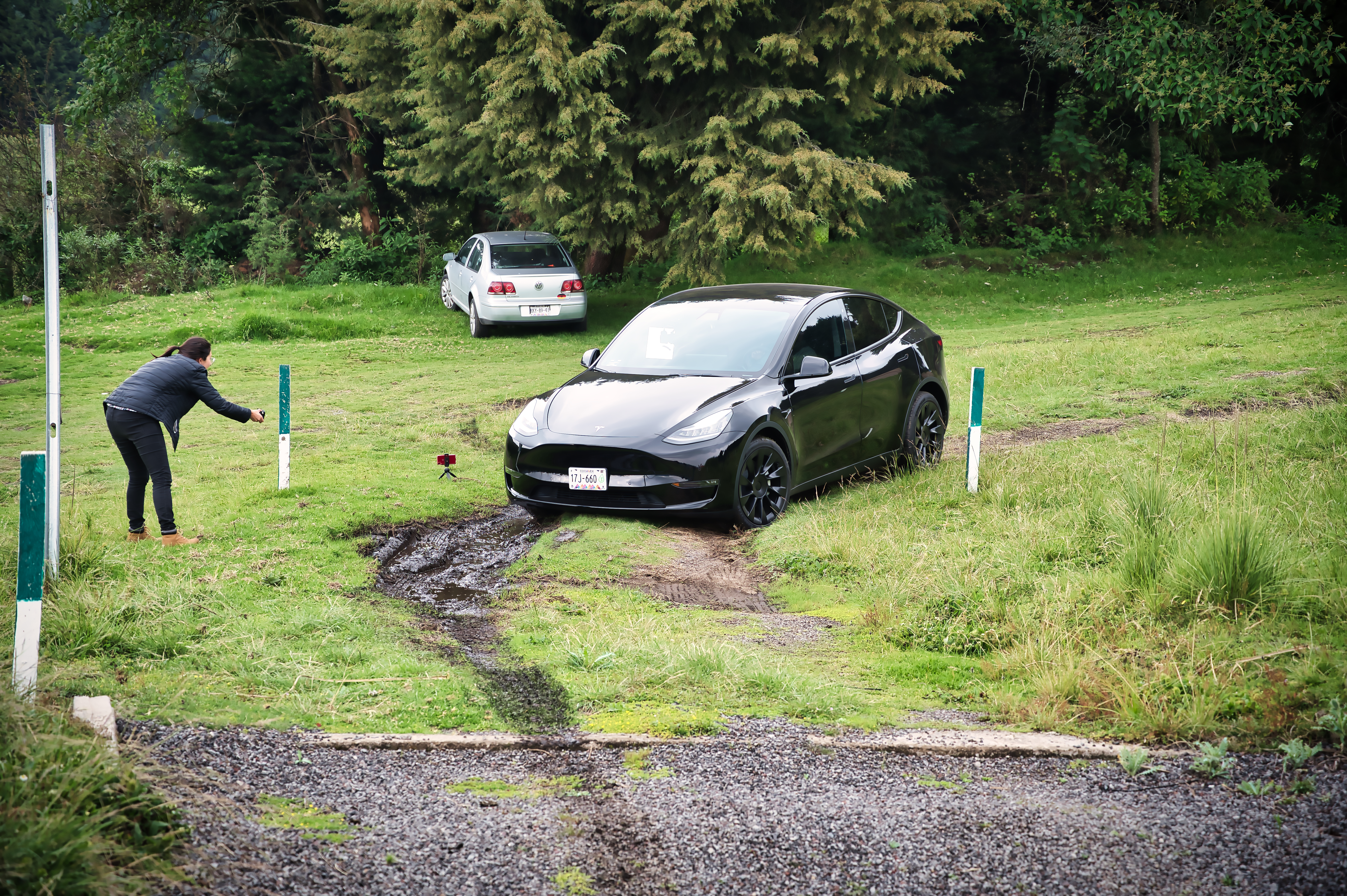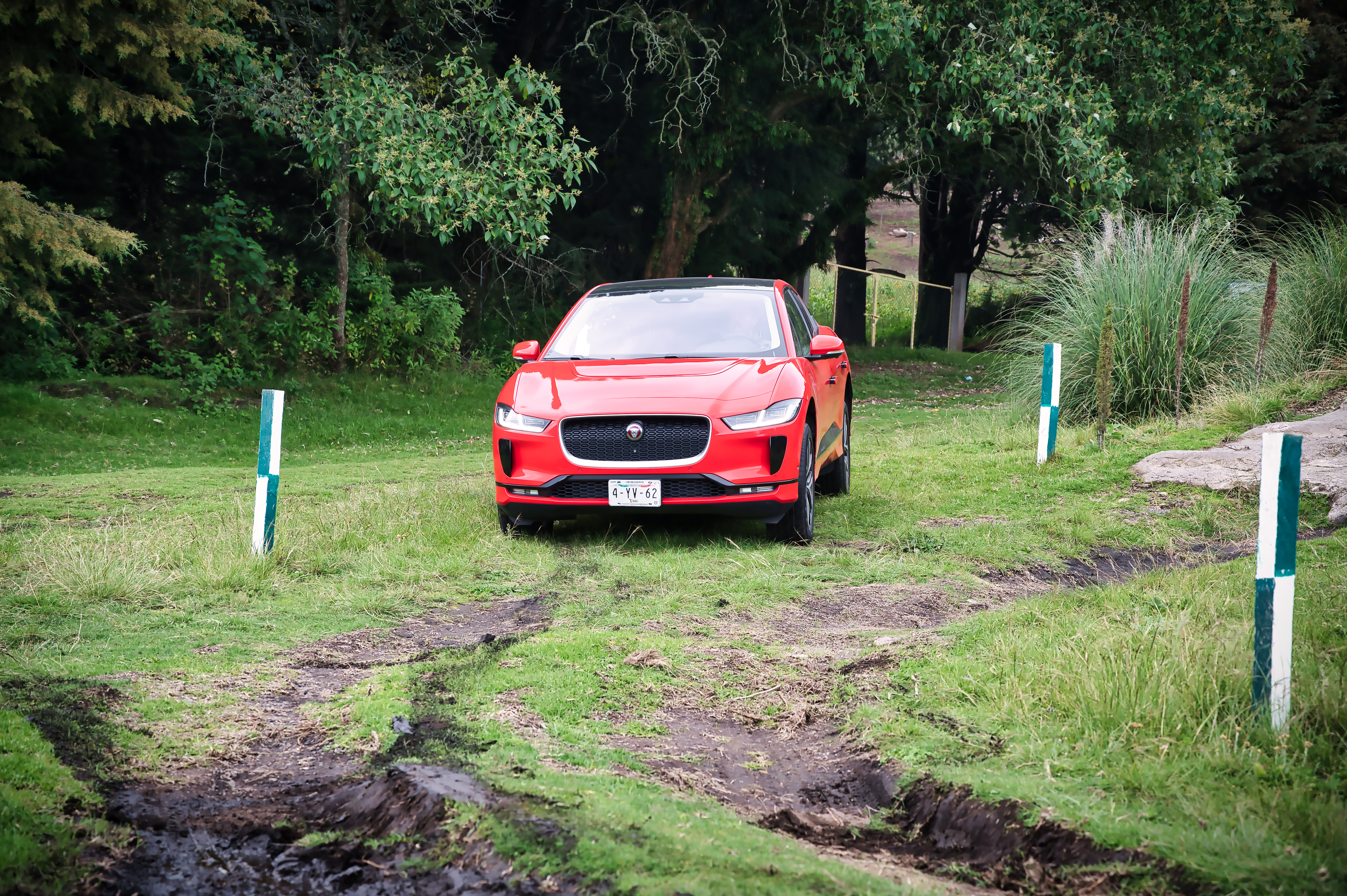El momento “Off Road” llego y bueno iniciaron con Mercedes Benz comenzaron a meterla a un terreno con grava con un tope grande, a medio camino en la parte mas plana ya iba a raspar abajo por lo que decidieron no intentarlo mas, luego llego el turno a Model Y igual empezó a entrar al camino de grava y cuando sentí tenia una piedra muy cerca de rozar detuvimos la prueba, todos aquí sabíamos que la mas capaz seria Jaguar i-Pace así que llego su turno la cual con la suspensión en su máxima altura, es ajustable, pudo pasar la primera parte de grava y llego al tope lo empezó a cruzar y justo en el centro se quedo atascada, creímos nada la sacaría de ahí pero después de 40 min y una 4×4 remolcándola por fin pudo salir, por este retraso ya no pudimos ver a e-tron en acción, aunque la verdad es que uno no anda con su SUV tratando de jugar a ‘Jurassic Park’ por lo que creo no era necesario tampoco.
